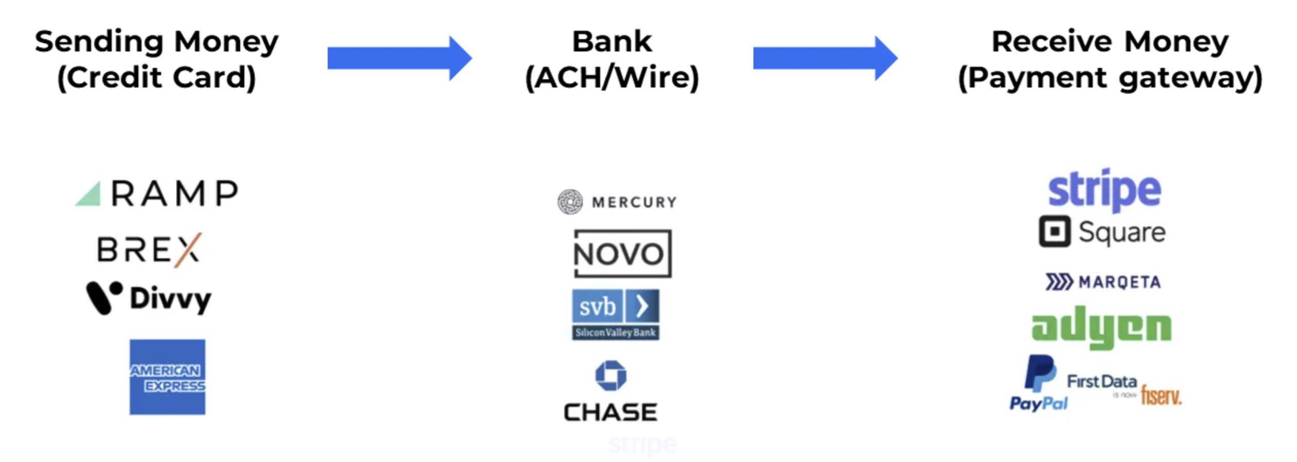 汇款支付:有一些初创公司通过发行信用卡参与了汇款业务的第一部分。例如: Brex, RAMP 等