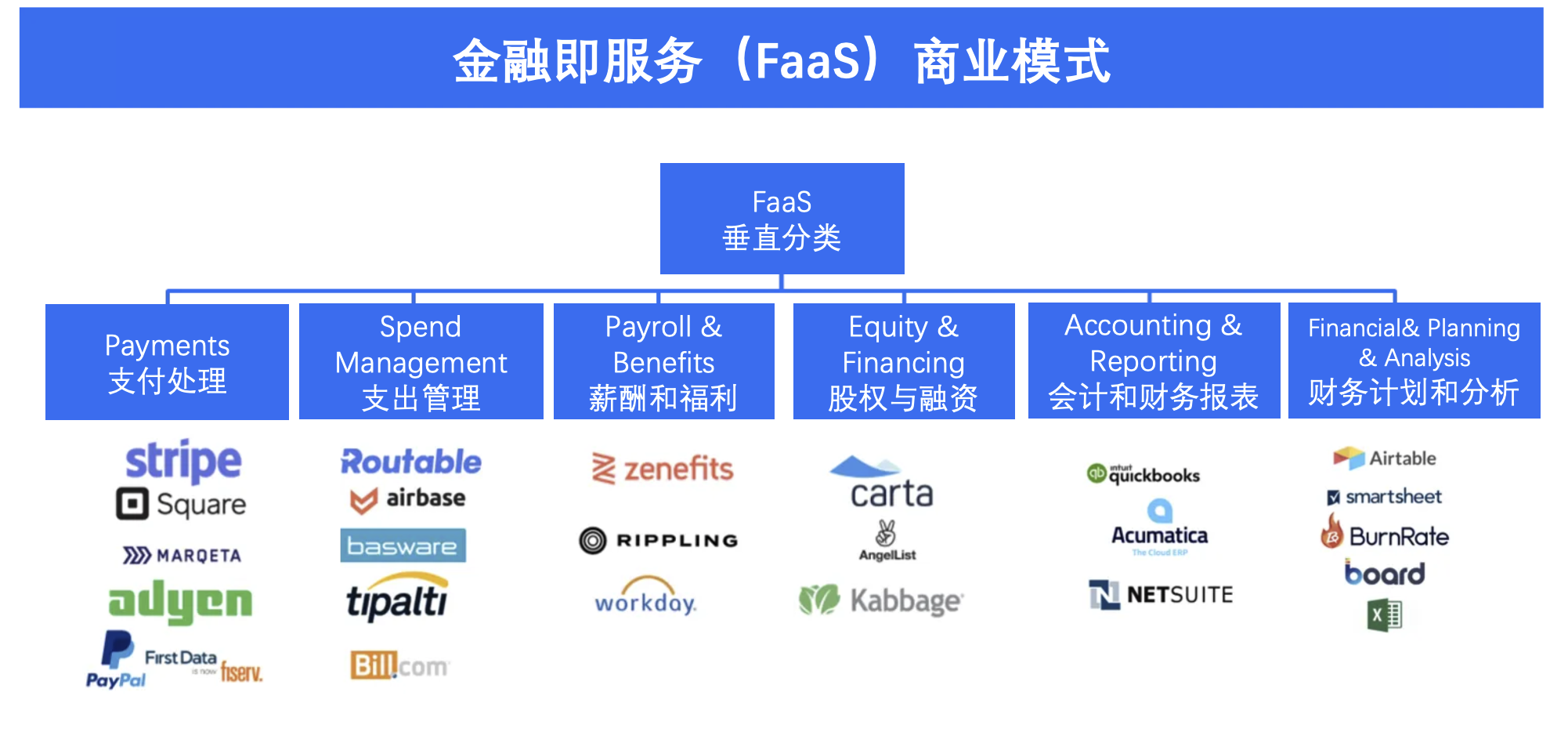 其实这个行业非常大,甚至可以把它认为是和 SaaS 平行的一个行业,叫 FaaS,金额即服务。它会有以下分类: