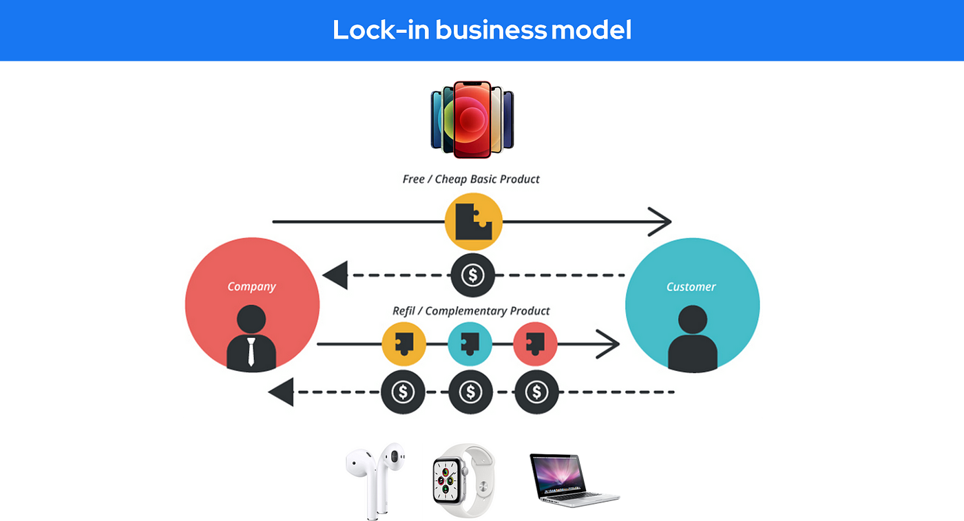 苹果卖给你一部 iPhone,然后用其他硬件 (手表、Airpod) 和平台服务 (如苹果商店、苹果音乐、云计算等) 把你锁定在他们的生态系统中。