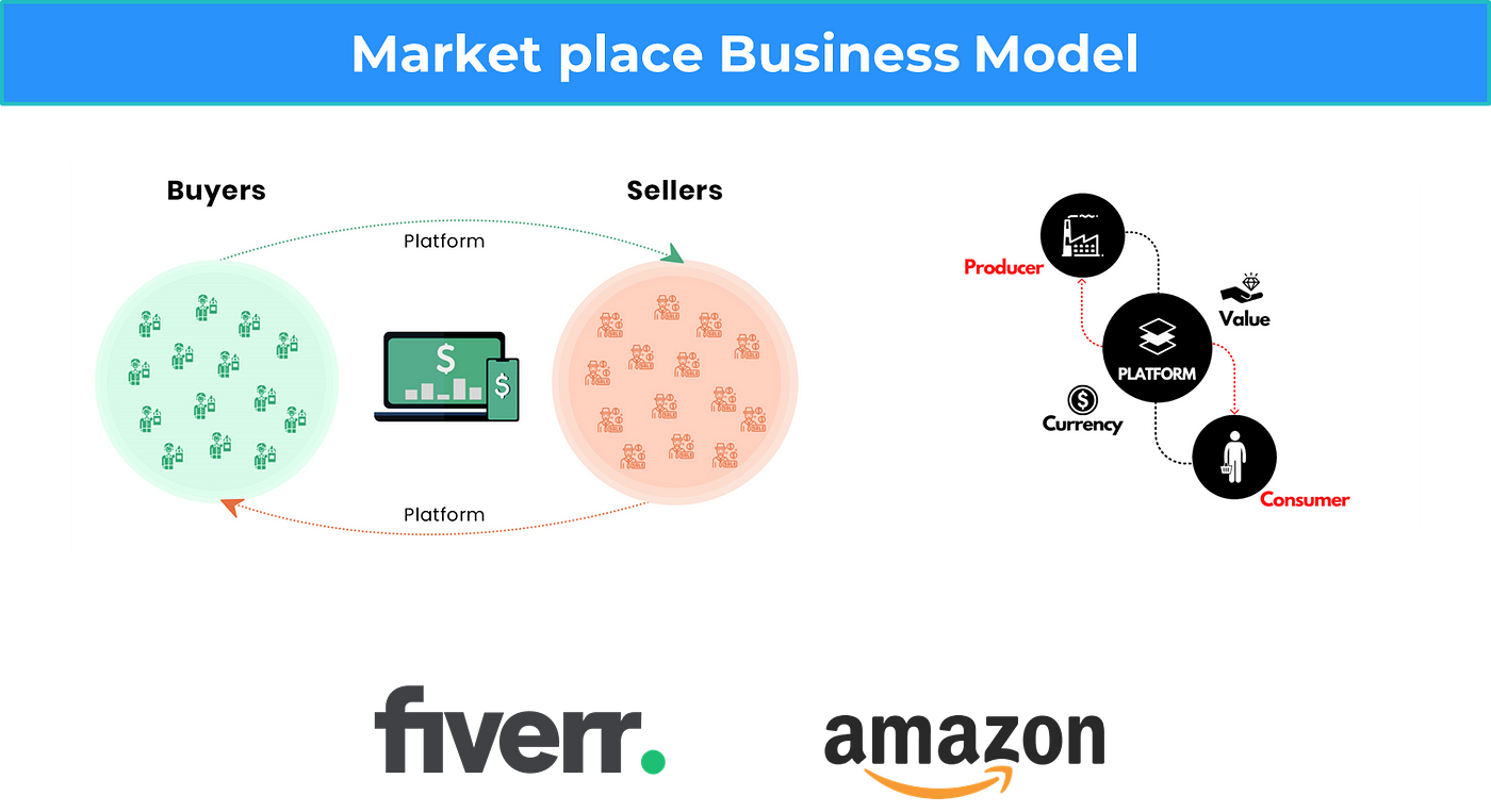 市场:像 Amazon 和 Fiverr 这样的市场连接供应商和客户,比如 Nike 在里面还是叫 Nike,并从这些供应商那里获得 10% - 20% 的收入分成。